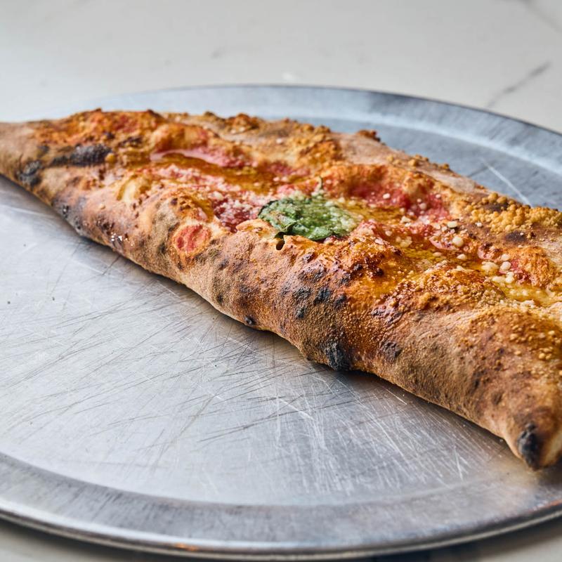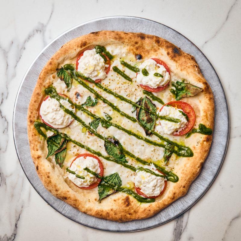 Fresh tomato, fresh mozzarella, oregano, olive oil, and basil. Finished with cold burrata cheese and pesto.
