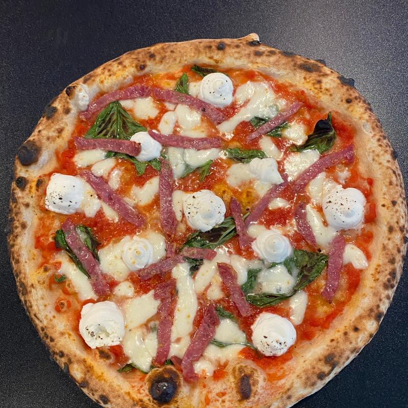 Ricotta, fresh mozzarella, sweet salami, and San Marzano tomatoes, Parmesan, and black pepper.