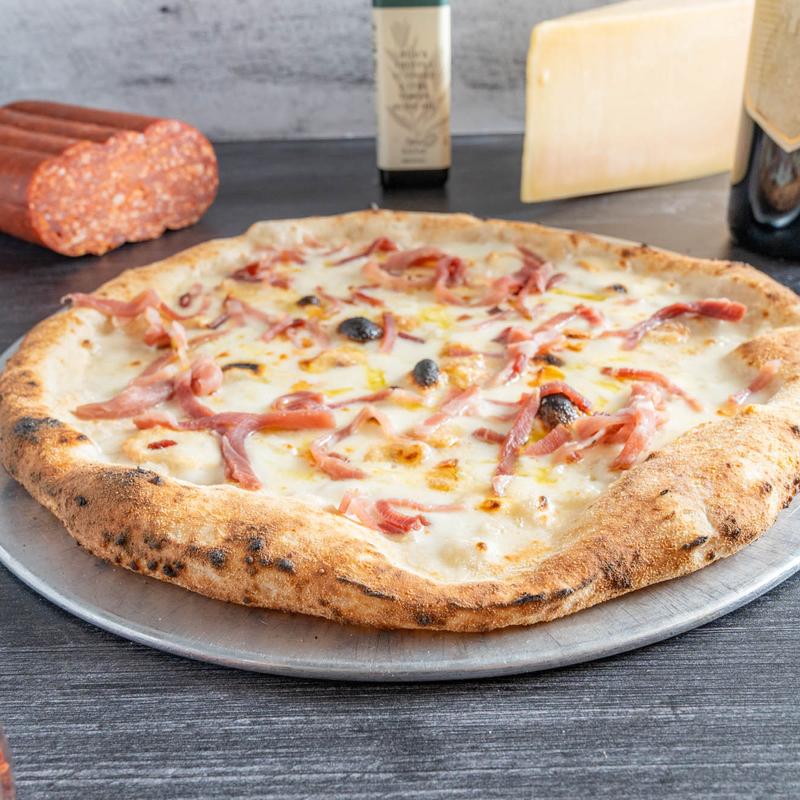Smoked mozzarella, Taleggio cheese, speck (smoked prosciutto), and truffle oil.