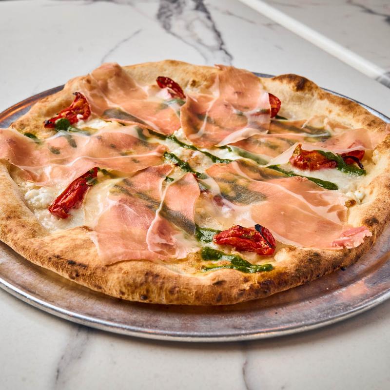 Fresh mozzarella , vesuvio cherry tomatoes, finished with Parma prosciutto,arugola, shaved parmesan, and olive oil.