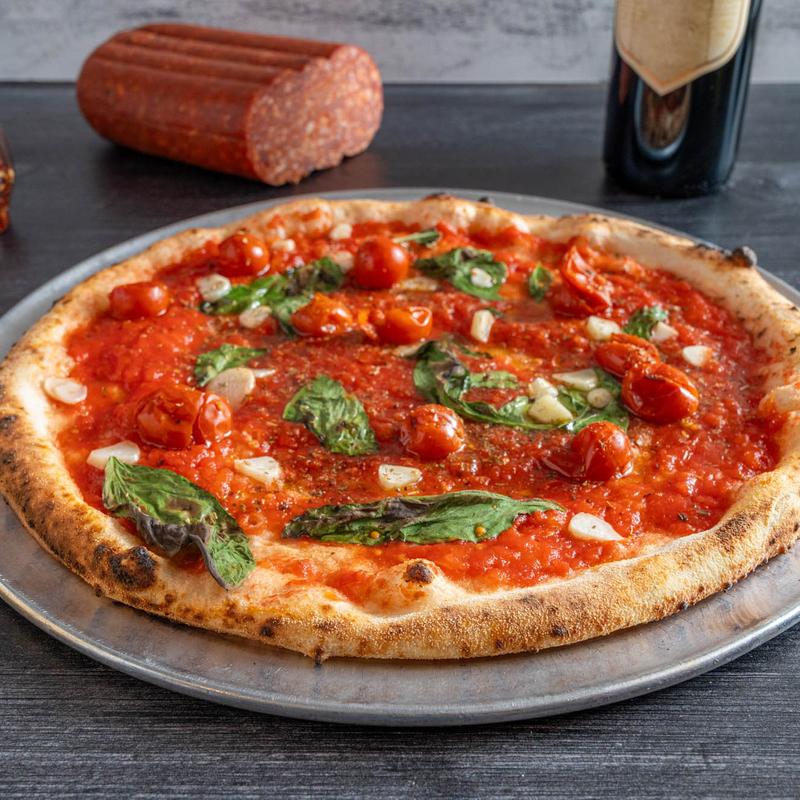 San Marzano tomatoes, Vesuvio cherry tomatoes, fresh mozzarella, spicy salami, and Calabrese hot peppers.